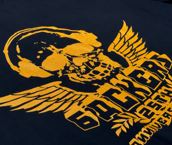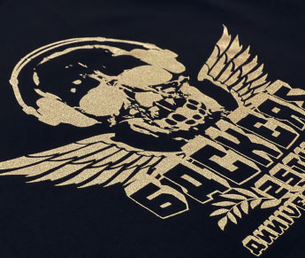 インクにラメ粒子を足した印刷方法。ベースカラーの選択で様々な色のラメプリントが可能です。