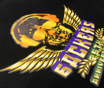 転写シートに生地色に似せた色のふちをつけた、全てのボディに対応可能な転写シート印刷です。